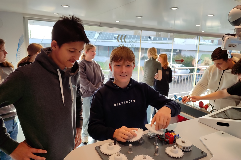 Berufe im Metallbereich sind abwechslungsreich, zukunftssicher und bieten ein breites Spektrum an Ausbildungsmöglichkeiten – das durften nun auch die Schülerinnen und Schüler der Sechta-Ries-Schule selbst erfahren. Um dieses vielfältige Berufsfeld zu erkunden, besuchten die Schülerinnen und Schüler der Klassenstufen 8 und 9 in der Woche vom 10.11. bis zum 14.11.2025 die Firma Leitz in Unterschneidheim. Dort erhielten die Schülerinnen und Schülern nicht nur spannende Einblicke in den Arbeitsalltag in der Metallindustrie, sondern durften auch eine Vielzahl von Metallberufen selbst ausprobieren. Zu diesem Zweck machte bei der Firma Leitz der Infotruck der Metall- und Elektroindustrie (M+E Infotruck) halt. Im Truck angekommen wurden den Schülerinnen und Schülern zunächst verschiedene Metallberufe vorgestellt. Anschließend erhielten die Schülerinnen und Schüler Tablets und durften dann die für sie interessanten Berufe im Detail erkunden, wobei typische Tätigkeiten im jeweiligen Beruf auch in Form von interaktiven Aufgaben ausprobiert werden konnten. Im zweiten Teil des Truckbesuchs wurden die Schülerinnen und Schüler dann in die verschiedenen Experimentierstationen des Infotrucks eingeführt. Highlights waren hier neben der CNC-Fräsmaschine, mit der die Schülerinnen und Schüler unter Anleitung kleine Werkstücke anfertigen durften, vor allem die „Electricity Bench“ (ein Schaltpult, welches ein Grundverständnis für Schaltungstechnik vermittelt) und der „Cobot“, ein kollaborativ arbeitender Roboter, der die Schülerinnen und Schüler bei der Lösung von mechanischen Fragestellungen unterstützte. Im weiteren Verlauf der Veranstaltung erhielten die Schülerinnen und Schüler dann nähere Einblicke in den Ablauf der Ausbildung und den Arbeitsalltag bei Firma Leitz. Auch bekamen die Schülerinnen und Schüler hier Gelegenheit, ihr Wissen über Metallberufe weiter zu vertiefen. So erklärten Auszubildende der Firma Leitz etwa die Funktionsweise der pneumatischen Regelungstechnik in sehr anschaulicher Form. Besonders interessant war es dabei für die Schülerinnen und Schüler, wenn Mitarbeiter aus ihrem Arbeitsalltag berichteten und von ihrem eigenen Werdegang erzählten. Zum Schluss stand noch eine Führung durch die Werkshallen von Firma Leitz auf dem Programm, bei der die Schülerinnen und Schüler auch moderne industrielle Produktionsverfahren (wie z. B. Industrieroboter) live erleben durften.